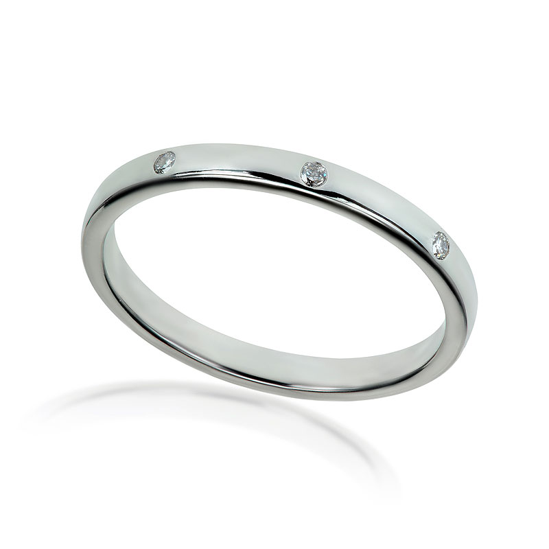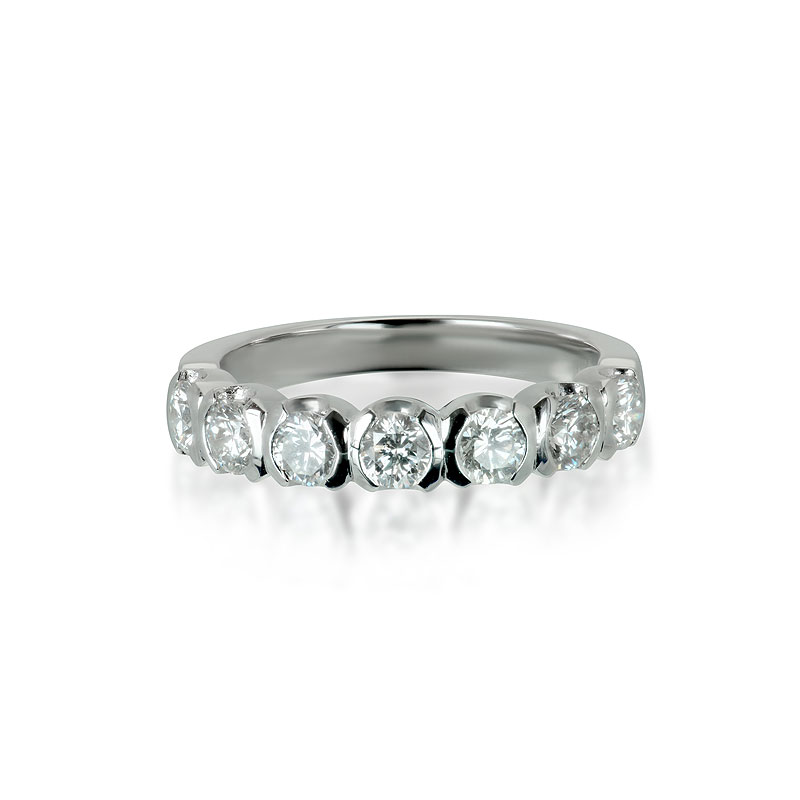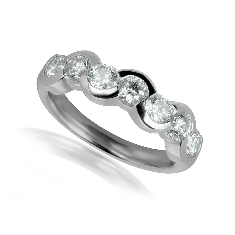 A contemp-orary seven stone ring featuring same size round brilliant cut diamonds held in a semi rubover setting and mounted on a D-shape band.