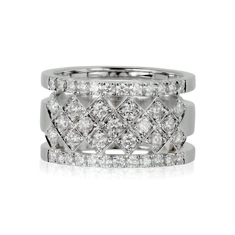 A beautiful diamond ring featuring two lines of pavé set all the way round at both edges of the ring.