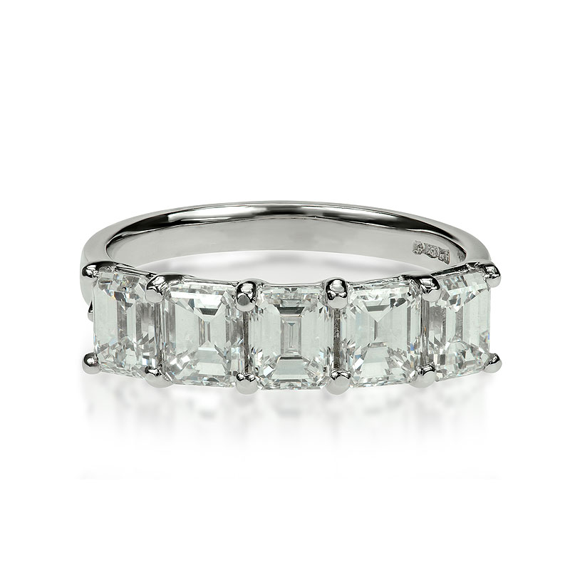 A seven stone eternity ring with equal size round diamonds held in a twist style setting.